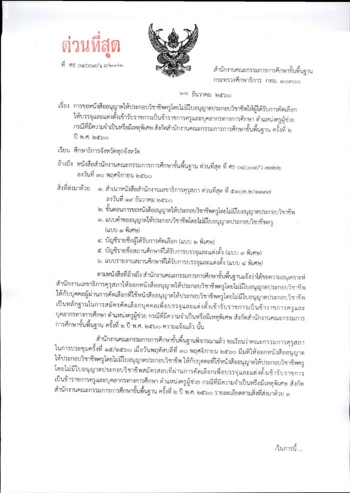 ด่วนที่สุด ที่ ศธ 04009/ว 8271 การขอหนังสืออนุญาตให้ประกอบวิชาชีพครูโดยไม่มีใบอนุญาตประกอบวิชาชีพให้ผู้ได้รับการคัดเลือกให้บรรจุและแต่งตั้งเข้ารับราชการเป็นข้าราชการครูและบุคลากรทางการศึกษา ตำแหน่งครูผู้ช่วย กรณีที่มีความจำเป็นหรือมีเหตุพิเศษ สังกัด สพฐ.ครั้งที่ 2 ปี พ.ศ. 2560