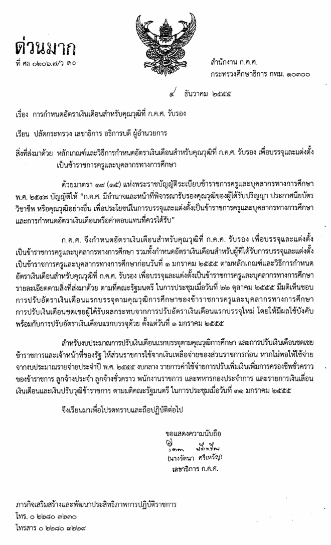 หนังสือ ที่ ศธ 0206.7/ว 30 เรื่อง การกำหนดอัตราเงินเดือนสำหรับคุณวุฒิที่ ก.ค.ศ.รับรอง