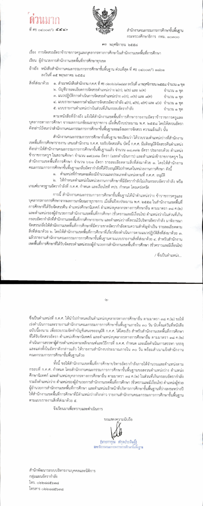 ด่วนมาก เรื่อง การจัดสรรอัตราข้าราชการครูและบุคลากรทางการศึกษาในสำนักงานเขตพื้นที่การศึกษา