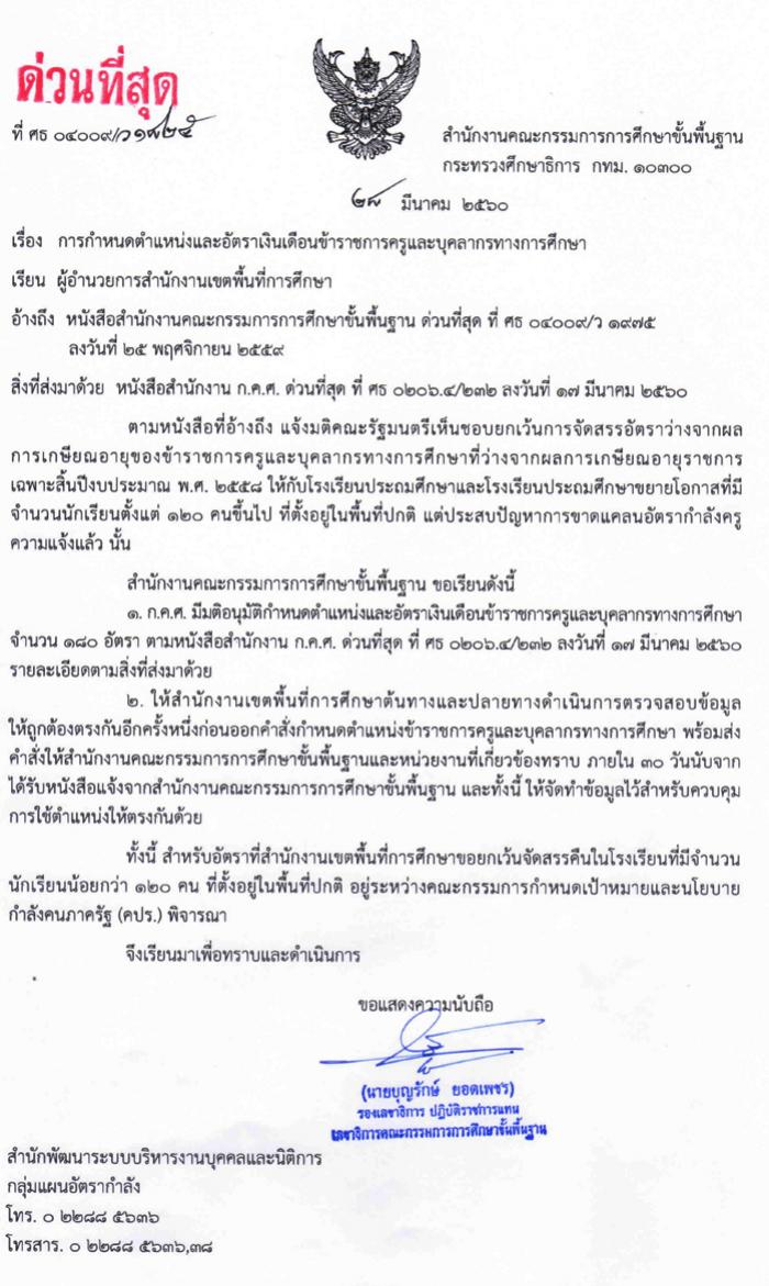 ด่วนที่สุด ที่ ศธ 04009/ว 1825 ลว.28 มี.ค. 60 เรื่องการกำหนดตำแหน่งและอัตราเงินเดือนข้าราชการครูฯ ที่ว่างจากผลการเกษียณอายุราชการ ปี 2558 ให้ รร.ประถมศึกษาและขยายโอกาสที่มี นร.ตั้งแต่ 120 คนขึ้นไป ในพื้นที่ปกติแต่ประสบปัญหาการขาดแคลนครู