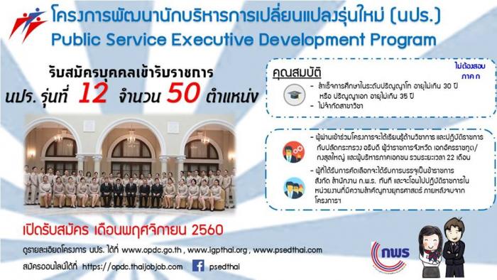 สำนักงานคณะกรรมการพัฒนาระบบราชการ (ก.พ.ร.) เปิดรับสมัครคัดเลือกบุคคลและข้าราชการเข้าเป็นข้าราชการโครงการพัฒนานักบริหารการเปลี่ยนแปลงรุ่นใหม่ รุ่นที่ 12 ภายใต้โครงการพัฒนานักบริหารการเปลี่ยนแปลงรุ่นใหม่ รุ่นที่ 12 จำนวน 50 ตำแหน่ง ระหว่างวันที่ 3 พ.ย. 60 ถึงวันที่ 12 ม.ค. 61