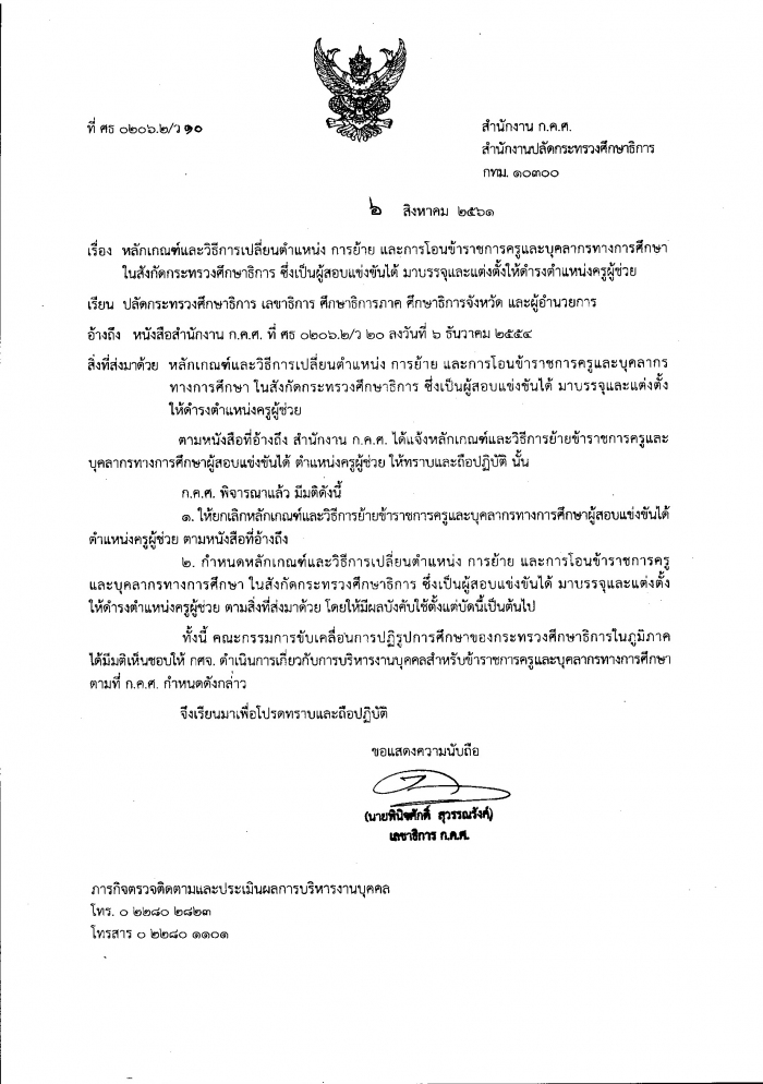 ว10/2561 หลักเกณฑ์และวิธีการเปลี่ยนตำแหน่ง การย้าย และการโอนข้าราชการครูและบุคลากรทางการศึกษาในสังกัดกระทรวงศึกษาธิการ ซึ่งเป็นผู้สอบแข่งขันได้ มาบรรจุและแต่งตั้งให้ดำรงตำแหน่งครูผู้ช่วย
