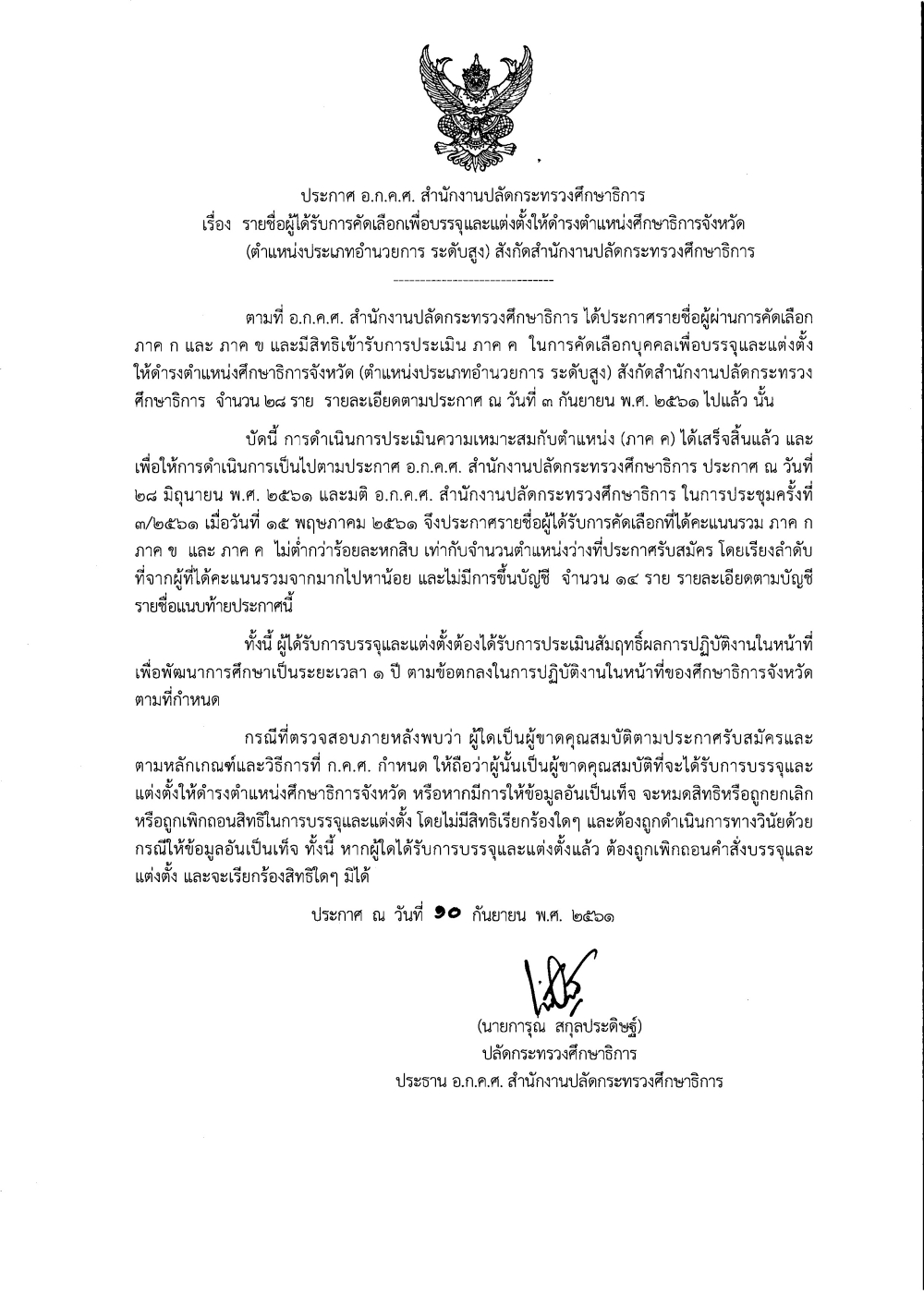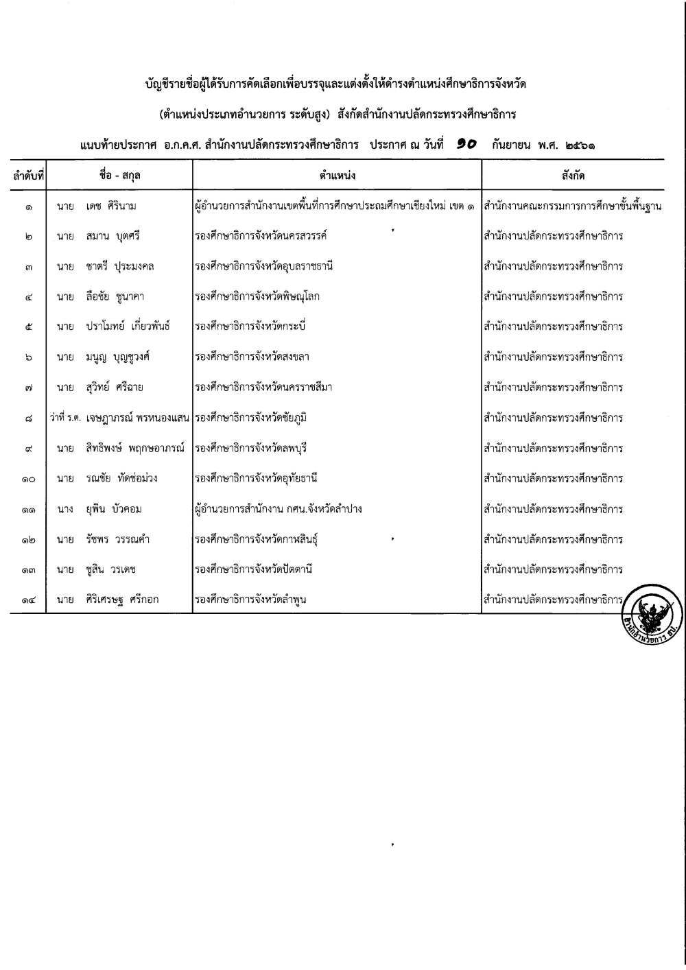 เรื่อง รายชื่อผู้ได้รับการคัดเลือกเพื่อบรรจุและแต่งตั้งให้ดำรงตำแหน่งศึกษาธิการจังหวัด