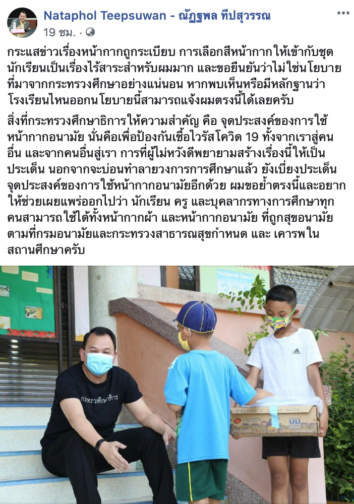 นายณัฏฐพล ทีปสุวรรณ รัฐมนตรีว่าการกระทรวงศึกษาธิการ ได้โพสต์ผ่านเฟซบุ๊ค Nataphol Teepsuwan - ณัฏฐพล ทีปสุวรรณ เกี่ยวกับมีการแชร์ข้อมูลเกี่ยวกับการให้นักเรียนสวมใส่หน้ากากอนามัยที่เป็นสีถูกระเบียบ หรือสีเดียวกันกับชุด จนเป็นที่วิพากษ์วิจารณ์กันทั่วไป ดังนี้
