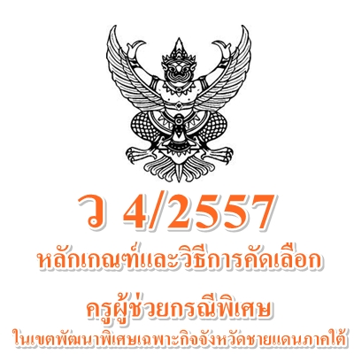 ว4/2557 หลักเกณฑ์และวิธีการคัดเลือกพนักงานราชการ ลูกจ้างประจำ พนักงานจ้างเหมาบริการ ครูอัตราจ้างหรือลูกจ้างชั่วคราวจากเงินงบประมาณ หรือเงินรายได้ของสถานศึกษา ครูสอนศาสนาอิสลาม หรือวิทยากรอิสลามศึกษา เพื่อบรรจุและแต่งตั้งบุคคลเข้ารับราชการเป็นข้าราชการครูและบุคลากรทางการศึกษา ตำแหน่งครูผู้ช่วย ในเขตพัฒนาพิเศษเฉพาะกิจจังหวัดชายแดนภาคใต้ เฉพาะจังหวัดยะลา นราธิวาส ปัตตานี และ 4 อำเภอ ในจังหวัดสงขลา (อำเภอจะนะ อำเภอสะบ้าย้อย อำเภอเทพา อำเภอนาทวี)