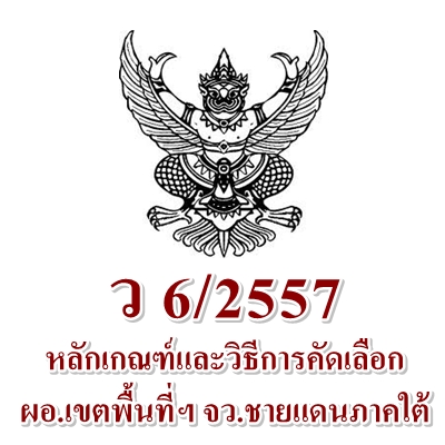 ว6/2557 หลักเกณฑ์และวิธีการคัดเลือกบุคคลเพื่อบรรจุและแต่งตั้งให้ดำรงตำแหน่ง ผู้อำนวยการสำนักงานเขตพื้นที่การศึกษา ในเขตพัฒนาพิเศษเฉพาะกิจจังหวัดชายแดนภาคใต้เฉพาะจังหวัดยะลา ปัตตานี และนราธิวาส สังกัดสำนักงานคณะกรรมการการศึกษาขั้นพื้นฐาน