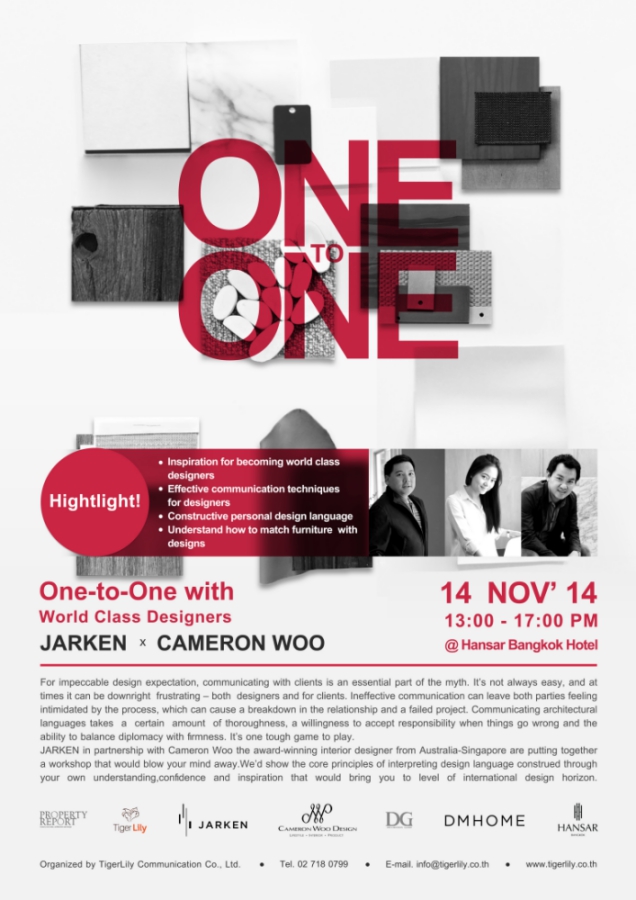 JARKEN ร่วมกับ Cameron Woo กับครั้งแรกที่สุดยอดบริษัทออกแบบตกแต่งชั้นนำของไทย และดีไซเนอร์ระดับโลก เจ้าของรางวัลสุดยอดนักออกแบบภายในและผู้ก่อตั้ง Cameron Woo Design (CWD) กับสัมมนาในหัวข้อ ‘How to take Thai designer in an international language of design’ เพื่อให้นักออกแบบไทยรุ่นใหม่ตระหนักถึงการสร้างรูปแบบผลงาน จากแก่นแท้ของแนวความคิด ความสามารถ ความมั่นใจ แรงบรรดาลใจที่ตัวคุณเองสามารถสร้างขึ้นได้ เพื่อให้ก้าวไกลถึงระดับโลก และการใช้การสื่อสารของภาษาสถาปัตยกรรม และการเข้าถึงพฤติกรรมและไลฟ์สไตล์ของลูกค้า ให้สอดคล้องและลงตัวควบคู่กัน นักออกแบบทั้งหลายจะได้สัมผัสโจทย์คำถาม และค้นหาคำตอบจากดีไซน์เนอร์ระดับโลกอย่างใกล้ชิด