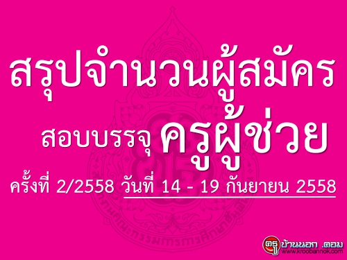 สพฐ.สรุปจำนวนผู้สมัครสอบแข่งขัน ตำแหน่งครูผู้ช่วย ครั้งที่ 2 ปี พ.ศ.2558 วันที่ 14 - 19 กันยายน 2558