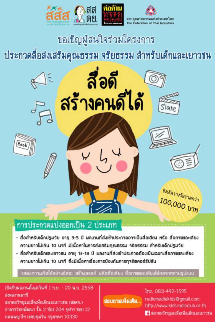 สมาคมวิทยุและสื่อเพื่อเด็กและเยาวชน (สสดย.) ร่วมกับ สำนักงานกองทุนสนับสนุนการสร้างเสริมสุขภาพ (สสส.) สภาอุตสาหกรรมแห่งประเทศไทย และสถาบันต่อต้านการทุจริตคอร์รัปชัน แห่งมหาวิทยาลัยธรรมศาสตร์ ขอเชิญผู้สนใจเข้าร่วม “โครงการประกวดสื่อส่งเสริมคุณธรรม จริยธรรม สำหรับเด็กและเยาวชน” เพื่อเสริมสร้างและปลูกฝังคุณธรรม จริยธรรม ที่ดีงาม เหมาะสม และส่งเสริมให้เกิดการสร้างสื่อปลอดภัยและสร้างสรรค์สำหรับเด็กและเยาวชน โดยแบ่งการประกวดเป็น 2 ประเภท คือ สื่อสำหรับเด็กปฐมวัย อายุ 3-5 ปี และสื่อสำหรับเด็กและเยาวชน อายุ 13-18 ปี