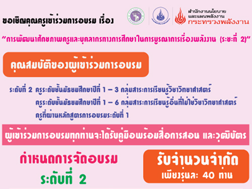 มหาวิทยาลัยเชียงใหม่ได้รับมอบหมายจาก สำนักงานนโยบายและแผนพลังงาน กระทรวงพลังงาน เพื่อจัดการอบรม เรื่อง การพัฒนาศักยภาพครูและบุคคลากรทางการศึกษาในการบูรณาการเรื่องพลังงาน (ระยะที่ 2 ) โดยมีการจัดการอบรมตามจังหวัดต่างๆ ดังตาราง จึงประชาสัมพันธ์มายังคุณครูสนใจเข้าร่วมอบรมสามารถกรอกแบบตอบรับและส่งมายังโครงการ ที่อีเมลล์ eedp.001@gmail.com โทรศัพท์ 096-1840744, 084-2237876 โทรสาร 053-944146 ต่อ 431