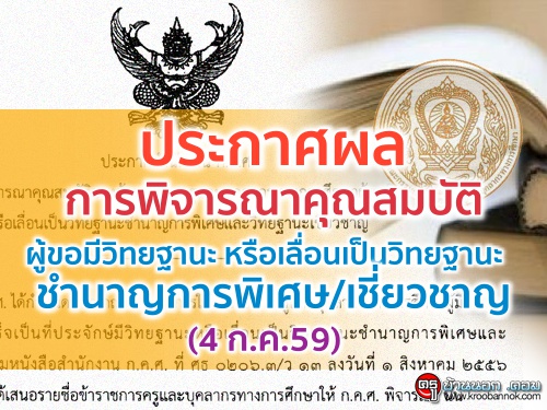 ประกาศผลการพิจารณาคุณสมบัติของข้าราชการครูและบุคลากรทางการศึกษาผู้ขอมีวิทยฐานะ หรือเลื่อนเป็นวิทยฐานะชำนาญการพิเศษและวิทยฐานะเชี่ยวชาญ