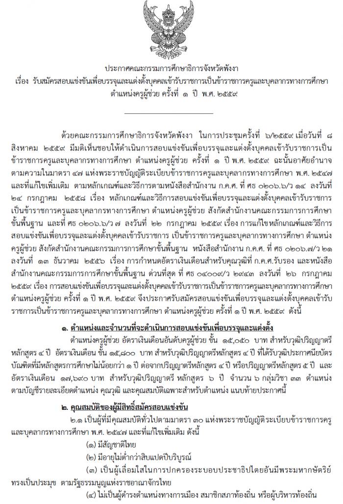 กศจ.พังงา รับสมัครสอบแข่งขันเพื่อบรรจุบุคคลเข้ารับราชการข้าราชการครูและบุคลากรทางการศึกษา ตำแหน่งครูผู้ช่วย ครั้งท่ี 1 ปี พ.ศ.2559