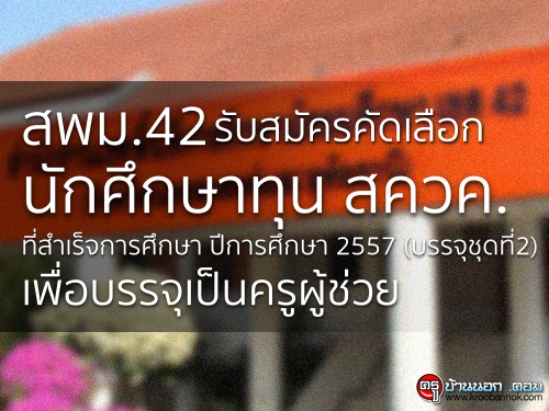 สพม.เขต 42 (นครสวรรค์ อุทัยธานี) รับสมัครคัดเลือกนักศึกษาทุนโครงการส่งเสริมการผลิตครูที่มีความรู้ความสามารถพิเศษทางวิทยาศาสตร์และคณิตศาสตร์ (สควค.) ที่สำเร็จการศึกษา ปีการศึกษา 2557 (บรรจุชุดที่ 2) เพื่อบรรจุและแต่งตั้งเข้ารับราชการเป็นข้าราชการครูและบุคลากรทางการศึกษา ตำแหน่งครูผู้ช่วย รายละเอียดดังเอกสารแนบ