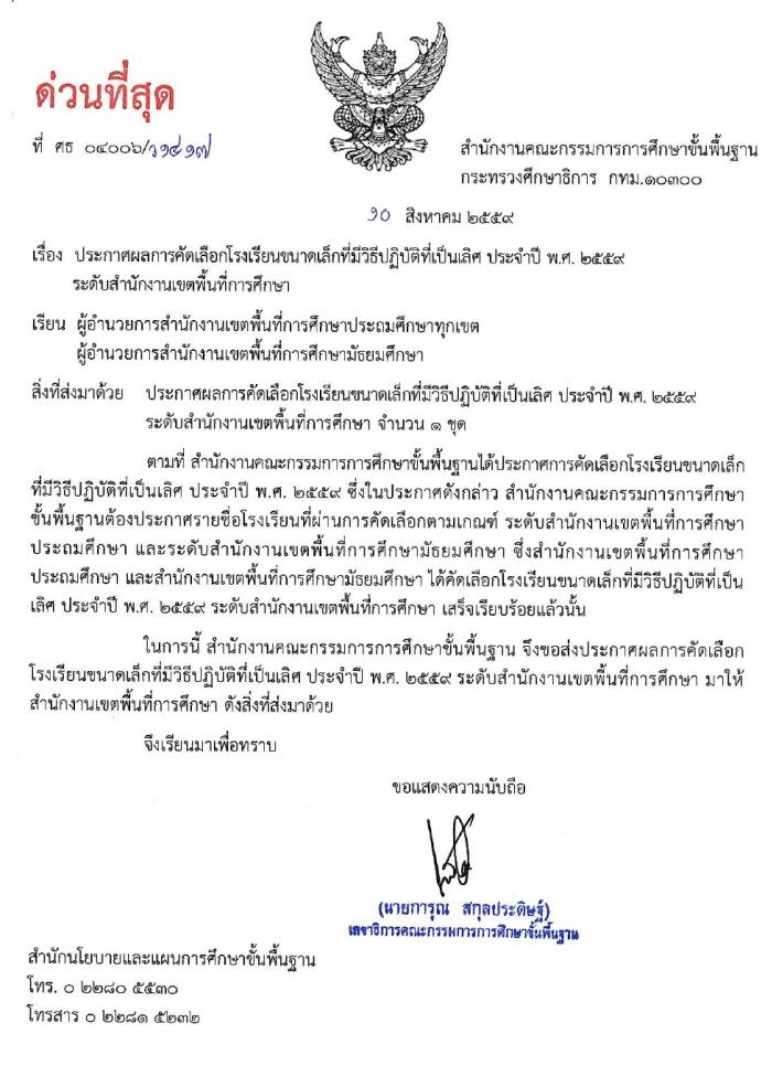 สำนักงานคณะกรรมการการศึกษาขั้นพื้นฐาน ประกาศผลการคัดเลือกโรงเรียนขนาดเล็กที่มีวิธีปฏิบัติที่เป็นเลิศ ประจำปี พ.ศ. 2559 ระดับสำนักงานเขตพื้นที่การศึกษา รายละเอียด