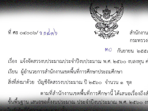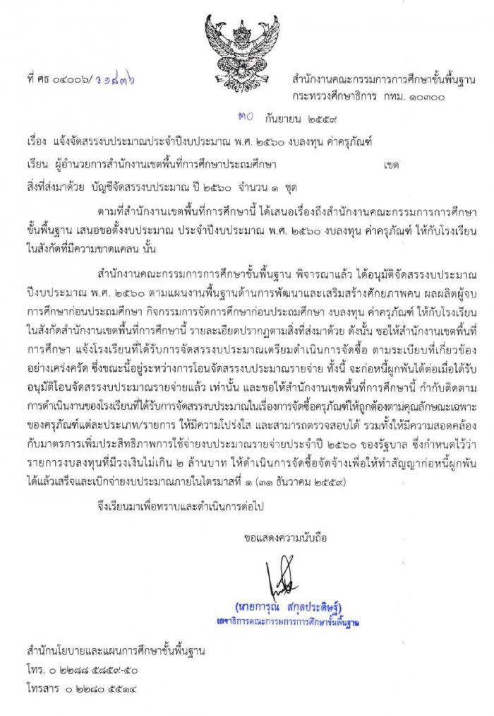 สำนักงานคณะกรรมการการศึกษาขั้นพื้นฐาน มีหนังสือแจ้งจัดสรรงบประมาณประจำปี งบประมาณ พ.ศ.2560 งบลงทุน ค่าครุภัณฑ์ (ผลผลิตก่อนประถม) รายละเอียด ดังนี้