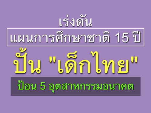 สกศ. เร่งทำแผนการศึกษาชาติ 15 ปี ปั้น “เด็กไทย” ป้อน 5 อุตสาหกรรมอนาคต “หุ่นยนต์ - การบินขนส่ง - เชื้อเพลิงชีวภาพ - ดิจิทัล - การแพทย์” ผลักดันเศรษฐกิจไทย ก่อนชง รมว.ศธ. พิจารณาส่ง 5 องค์กรหลัก ศธ. ปฏิบัติ