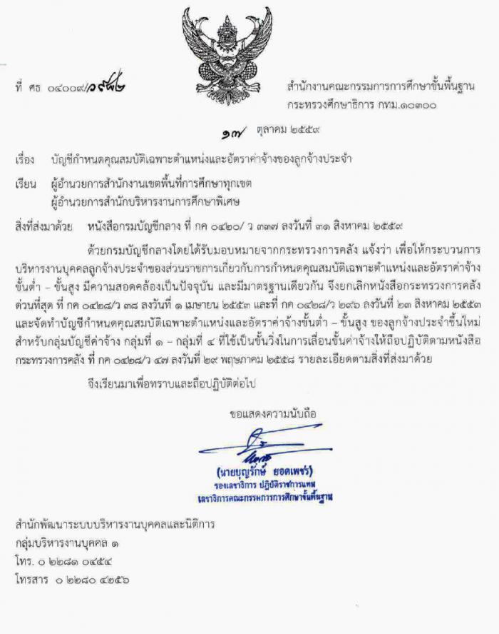 ที่ ศธ 04009/ว982 บัญชีกำหนดคุณสมบัติเฉพาะตำหน่งและอัตราค่าจ้างของลูกจ้างประจำ