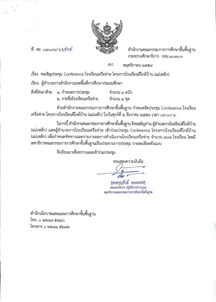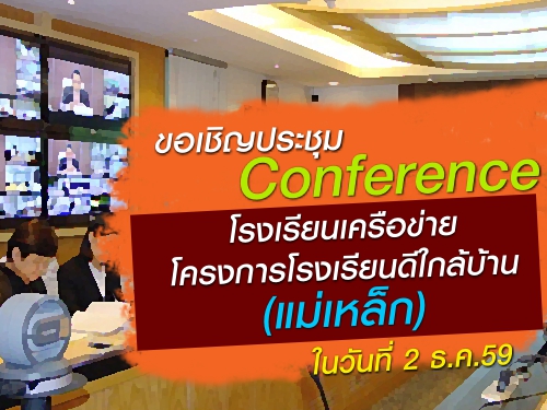 สำนักงานคณะกรรมการการศึกษาขั้นพื้นฐาน ได้มีหนังสือ ที่ ศธ 04006/ว1168 ลงวันที่ 30 พ.ย.2559 เรื่อง ขอเชิญประชุม Conference โรงเรียนเครือข่าย โครงการโรงเรียนดีใกล้บ้าน (แม่เหล็ก) ในวันที่ 2 ธันวาคม 2559 เวลา 09.00 น. เพื่อกำหนดทิศทางและรายงานผลการดำเนินงานโรงเรียนเครือข่าย จำนวน 702 โรงเรียน โดยมีเลขาธิการคณะกรรมการการศึกษาขั้นพื้นฐาน เป็นประธานในการประชุม รายละเอียด ดังนี้
