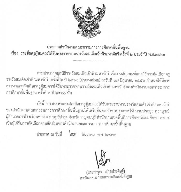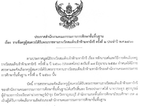 ประกาศสำนักงานคณะกรรมการการศึกษาขั้นพื้นฐาน เรื่อง รายชื่อครูผู้สมควรได้รับรางวัลสมเด็จเจ้าฟ้ามหาจักรี ครั้งที่ 2 ปี 2560