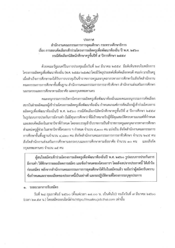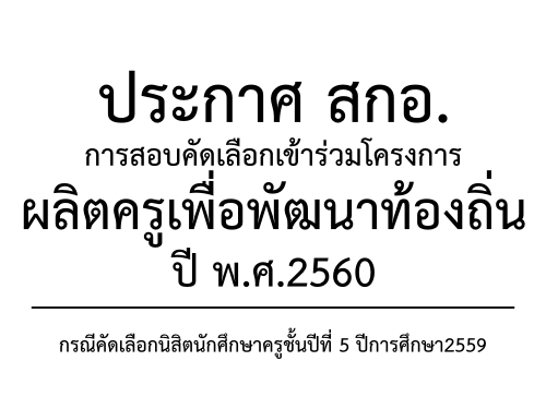 ประกาศสำนักงานคณะกรรมการการอุดมศึกษา เรื่อง การสอบคัดเลือกเข้าร่วมโครงการผลิตครูเพื่อพัฒนาท้องถิ่น ปี พ.ศ. ๒๕๖๐ กรณีคัดเลือกนิสิตนักศึกษาครูชั้นปีที่ ๕ ปีการศึกษา ๒๕๕๙