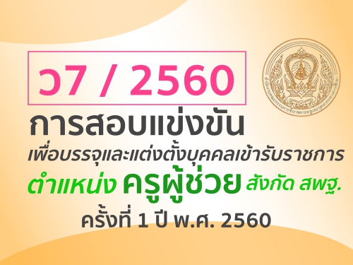 สำนักงาน ก.ค.ศ. ได้เผยแพร่หนังสือ ที่ ศธ 0206.6/ว7 ลงวันที่ 23 มีนาคม 2560 เรื่องการสอบแข่งขันเพื่อบรรจุและแต่งตั้งบุคคลเข้ารับราชการเป็นข้าราชการครูและบุคลากรทางการศึกษาตำแหน่งครูผู้ช่วย สังกัดสำนักงานคณะกรรมการการศึกษาขั้นพื้นฐาน ครั้งที่ 1 ปี พ.ศ. 2560 รายละเอียด ดังนี้