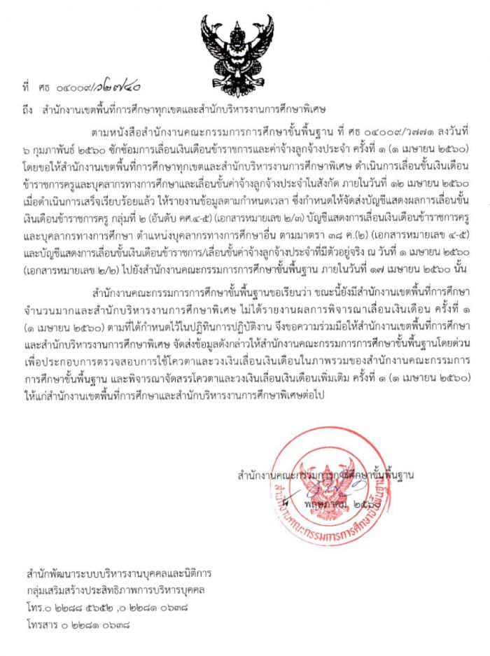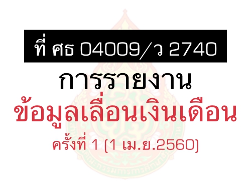 ที่ ศธ 04009/ว 2740 การรายงานข้อมูลเลื่อนเงินเดือนครั้งที่ 1 (1 เม.ย.2560)