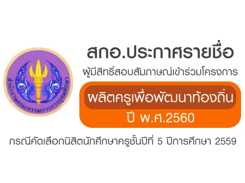 สำนักงานคณะกรรมการการอุดมศึกษา (สกอ.) ประกาศรายชื่อผู้มีสิทธิ์สอบสัมภาษณ์เข้าร่วมโครงการผลิตครูเพื่อพัฒนาท้องถิ่นปี พ.ศ.๒๕๖๐ กรณีคัดเลือกนิสิตนักศึกษาครูชั้นปีที่ ๕ ปีการศึกษา ๒๕๕๙