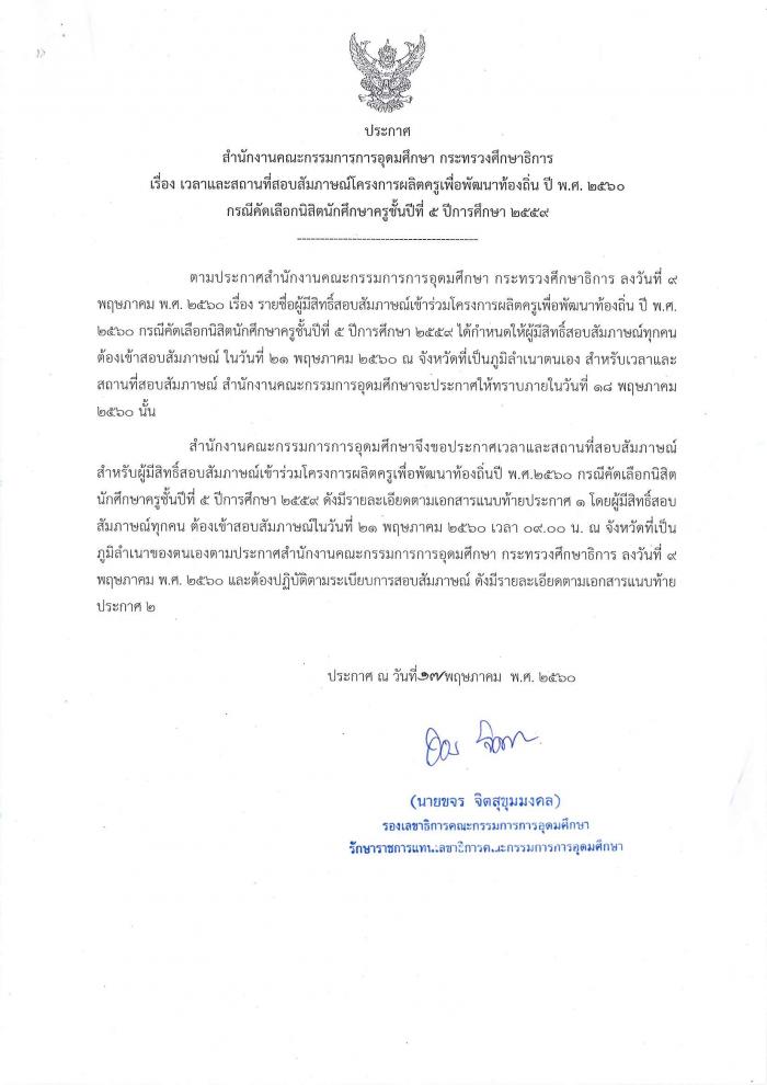 ประกาศ เรื่องเวลาและสถานที่สอบสัมภาษณ์โครงการผลิตครูเพื่อพัฒนาท้องถิ่น ปี พ.ศ. 2560 กรณีคัดเลือกนิสิตนักศึกษาครูชั้นปีที่ 5 ปีการศึกษา 2559