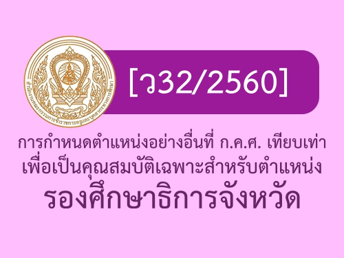 [ว32/2560] การกำหนดตำแหน่งอย่างอื่นที่ ก.ค.ศ. เทียบเท่า เพื่อเป็นคุณสมบัติเฉพาะสำหรับตำแหน่งรองศึกษาธิการจังหวัด อ้างถึง หนังสือสำนักงาน ก.ค.ศ. ที่ ศธ 0206.5/ว11 ลงวันที่ 28 เมษายน 2560