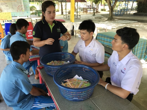 ด้าน ครูอรนุช แก้ววิเศษ ครูสอนสิ่งแวดล้อมศึกษา มิติสังคม กล่าวถึงการนำหลอดน้ำดื่มมาทำเป็นไส้หมอนว่า โรงเรียนมีฐานการเรียนรู้ธนาคารขยะ แต่ความสำเร็จของธนาคารขยะไม่ใช่ทำอย่างไรให้ได้เงินจำนวนมาก แต่เป็นเรื่องของการลดปริมาณขยะและนำขยะมาใช้ประโยชน์ให้ได้มากที่สุดมากกว่า เช่น การที่นักเรียน ม.3/2 ที่เป็นเจ้าของฐานนวัตกรรมต่อยอดหลอดเป็นหมอน เป็นโครงงานที่เด็กคิดขึ้นเพราะพบว่าแต่ละวันมีปริมาณของหลอดที่ถูกทิ้งเป็นจำนวนมาก อย่างที่โรงเรียนมีนักเรียน 1,700 คน แต่ละคนหากดื่มน้ำเพียงวันละขวดก็จะมีหลอดถูกทิ้งวันละ 1,700 หลอดเป็นอย่างน้อย และส่งผลทำให้ท่อน้ำทิ้งอุดตัน นักเรียนจึงนำปัญหานี้เข้าสู่กระบวนการบันได 7 ขั้น พบงานวิจัยว่า หลอดมีคุณสมบัติยืนหยุ่นได้ ไม่จับฝุ่น ซักล้างได้ จึงทำการคัดแยกหลอดแล้วนำไปล้าง ตัด เพื่อทำเป็นไส้หมอนทั้งหมอนหนุน หมอนอิง โดยมีการออกแบบเพื่อความสวยงามและสะดวกในการใช้งาน เมื่อนำไปทดลองให้ผู้ป่วยติดเตียงและผู้สูงอายุใช้ ปรากฏว่าได้ผลดี สามารถลดปัญหาแผลกดทับได้ และหมอนยังมีความยืดหยุ่นและระบายอาการได้ดีด้วย โดยขณะนี้เด็ก ได้เริ่มเข้าสู่กระบวนการบันไดขั้นที่ 7 แล้ว นั่นคือการขยายผลสู่ชุมชน ซึ่งกระบวนการเรียนรู้ที่เกิดขึ้นนี้ เด็กๆ ยังสามารถนำไปต่อยอดสู่การเป็นอาชีพในอนาคตได้อีกด้วย