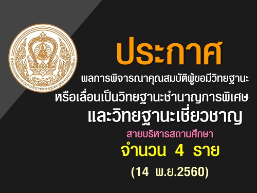 ประกาศสำนักงาน ก.ค.ศ. เรื่อง ผลการพิจารณาคุณสมบัติของข้าราชการครูและบุคลากรทางการศึกษา ผู้ขอมีวิทยฐานะหรือเลื่อนเป็นวิทยฐานะชำนาญการพิเศษและวิทยฐานะเชี่ยวชาญ สายบริหารสถานศึกษา ประกาศ ณ วันที่ 14 พฤศจิกายน พ.ศ. 2560 (จำนวน 4 ราย)