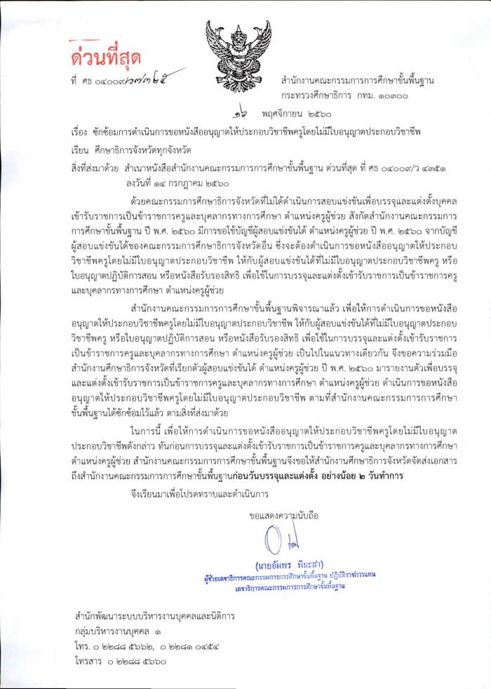 ด่วนที่สุด ที่ ศธ 04009/ว 7325 ซักซ้อมการดำเนินการขอหนังสืออนุญาตให้ประกอบวิชาชีพครูโดยไม่มีใบอนุญาตประกอบวิชาชีพ
