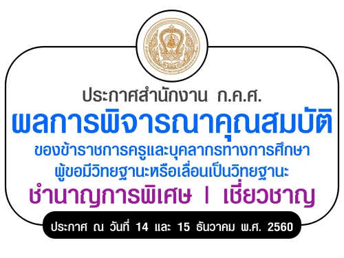 ประกาศสำนักงาน ก.ค.ศ. เรื่อง ผลการพิจารณาคุณสมบัติของข้าราชการครูและบุคลากรทางการศึกษา ผู้ขอมีวิทยฐานะหรือเลื่อนเป็นวิทยฐานะชำนาญการพิเศษและวิทยฐานะเชี่ยวชาญ ประกาศ ณ วันที่ 14 ธันวาคม พ.ศ. 2560 (จำนวน 1 ราย)
