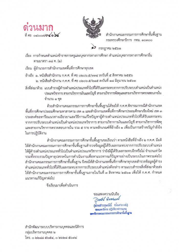 ที่ ศธ 04009/ว4164 การกำหนดตำแหน่งข้าราชการครูและบุคลากรทางการศึกษา ตำแหน่งบุคลากรทางการศึกษาอื่น ตามมาตรา 38 ค.(2)