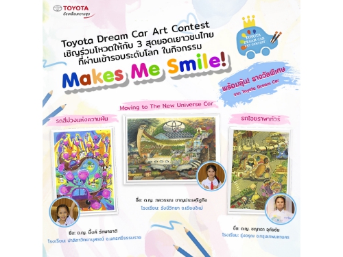 นอกจากนี้โครงการ Toyota Dream Art Contest 2018 ประเทศญี่ปุ่น ยังจัดกิจกรรม Makes Me Smile! ที่เปิดโอกาสให้ทุกคนทั่วโลก ได้เข้าร่วมโหวตผ่านเว็บไซต์โดยผลงานศิลปินไทยตัวน้อยทั้ง 3 คน ได้อยู่ในกิจกรรมนี้ด้วยเช่นเดียวกัน ดังนั้นบริษัท โตโยต้า มอเตอร์ ประเทศไทย จำกัด จึงขอเชิญชวน ให้ทุกท่าน ร่วมสนับสนุนผลงานเยาวชนไทยภาพผลงานของน้องๆ ที่ได้จำนวนการโหวตสูงสุด จะได้รับรางวัลพิเศษ “
