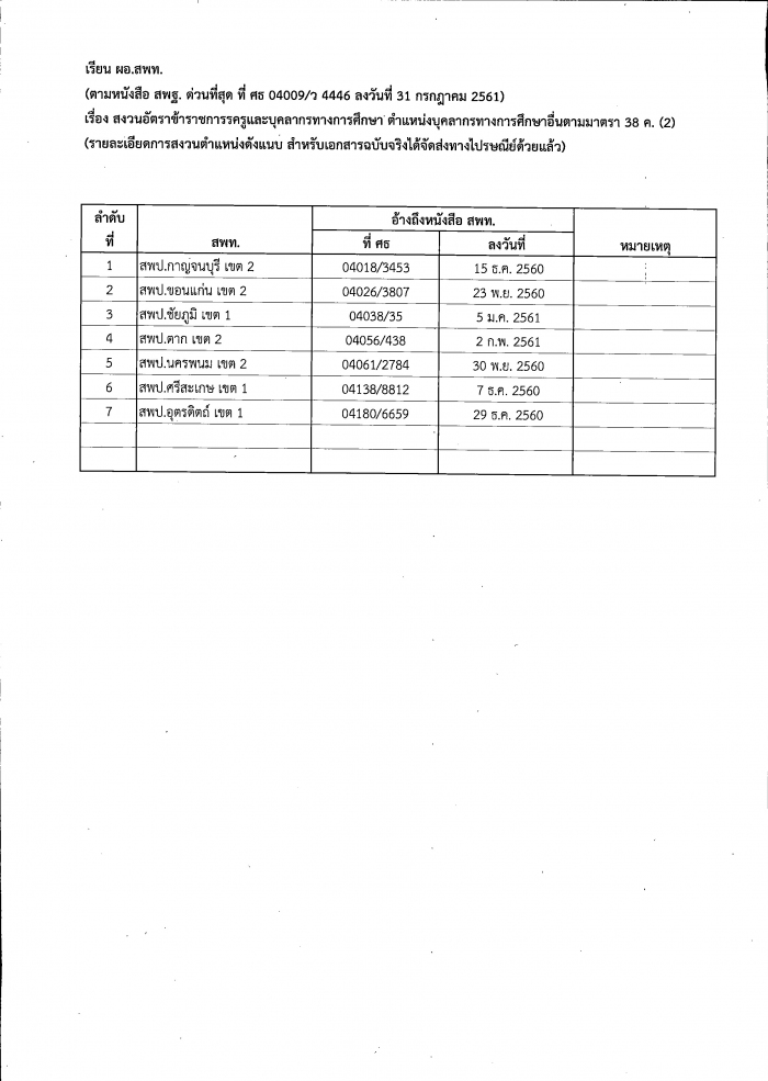 ด่วนที่สุด ที่ ศธ 04009/ ว 4446 เรื่อง สงวนอัตราข้าราชการครูและบุคลากรทางการศึกษา ตำแหน่งบุคลากรทางการศึกษาอื่นตามมาตรา 38ค (2)