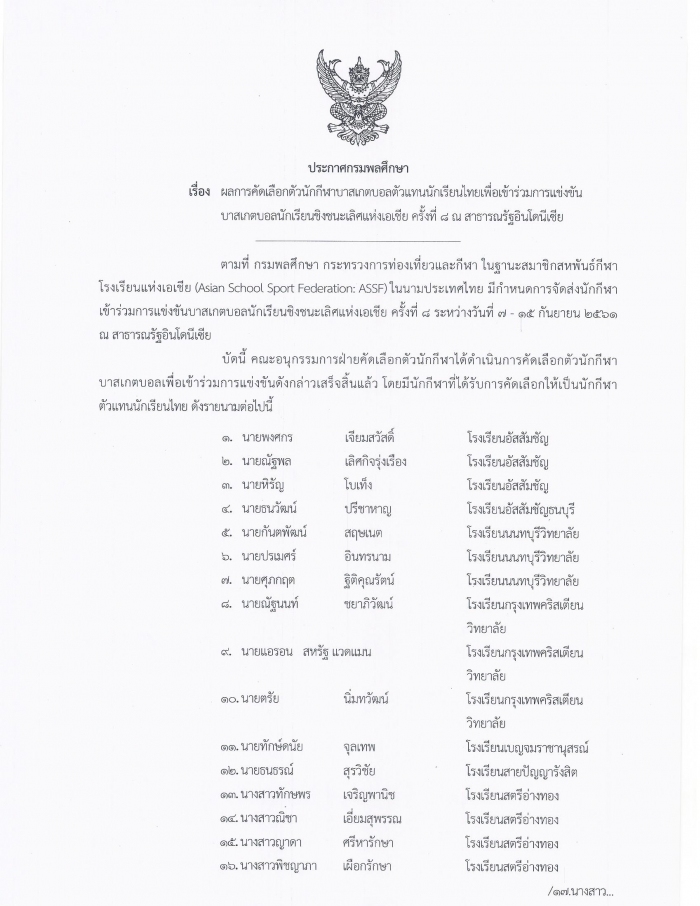 ประกาศกรมพลศึกษา เรื่อง ผลการคัดเลือกตัวนักกีฬาบาสเกตบอลตัวแทนนักกีฬาไทยเพื่อเข้าร่วมการแข่งขันบาสเกตบอลนักเรียนชิงชนะเลิศแห่งเอเชีย ครั้งที่ 8 ระหว่างวันที่ 7-15 กันยายน 2561 ณ สาธารณรัฐอินโดนีเซีย