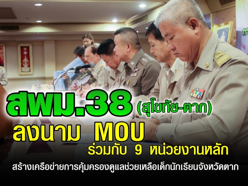 สำนักงานเขตพื้นที่การศึกษามัธยมศึกษา(สพม.) เขต 38 (สูโขทัย-ตาก) จัดพิธีลงนามบันทึกข้อตกลงความร่วมมือ (Memorandam of understanding :MOU) การมีส่วนร่วมของเครือข่ายการคุ้มครองดูแลช่วยเหลือเด็กนักเรียนจังหวัดตาก ซึ่งเป็นการดำเนินงานเพิ่มเติมจากการดำเนินการตามคำสั่งคณะ กรรมการคุ้มครองเด็กจังหวัดตากตามพระราชบัญญัติคุ้มครองเด็กพ. ศ. 2546 มาตรา 17 ร่วมกับ 9 หน่วยงานหลัก ได้แก่ 1. ที่ทำการปกครองจังหวัดตาก 2.ตำรวจภูธรจังหวัดตาก 3.สำนักงานสาธารณสุขจังหวัดตาก 4.สำนักงานพัฒนาสังคมและความมั่นคงของมนุษย์จังหวัดตาก 5.บ้านพักเด็กและครอบครัวจังหวัดตาก 6.สถานพินิจและคุ้มครองเด็กและเยาวชนจังหวัดตาก 7.สำนักงานวัฒนธรรมจังหวัดตาก 8.สำนักงาน กศน.จังหวัดตาก 9.ศูนย์การศึกษาพิเศษประจำจังหวัดตาก 10.สำนักงานเขตพื้นที่การศึกษามัธยมศึกษา(สพม.) เขต 38 (สูโขทัย-ตาก)