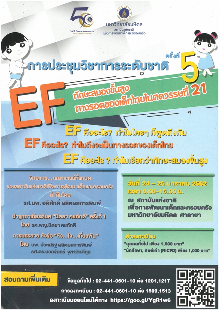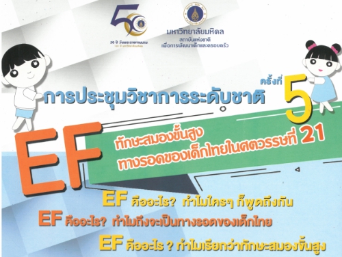 เนื่องในโอกาสฉลองครบรอบ 50 ปี วันพระราชทานนาม 131 ปี มหาวิทยาลัยมหิดล สถาบันแห่งชาติเพื่อการพัฒนาเด็กและครอบครัว มหาวิทยาลัยมหิดล กำหนดจัดการประชุมวิชาการระดับชาติ ครั้งที่ 5 ประจำปี พ.ศ. 2562 ในหัวข้อ “EF....ทักษะสมองขั้นสูง ทางรอดของเด็กไทยในศตวรรษที่ 21” ระหว่างวันที่ 24-25 มกราคม พ.ศ.2562 เวลา 08.30-16.30 น. ณ อาคารปัญญาวัฒนา สถาบันแห่งชาติเพื่อการพัฒนาเด็กและครอบครัว มหาวิทยาลัยมหิดลศาลายา จังหวัดนครปฐม