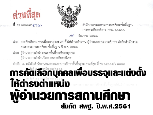 ด่วนที่สุด ที่ ศธ 04009/4681 การคัดเลือกบุคคลเพื่อบรรจุและแต่งตั้งให้ดำรงตำแหน่งผู้อำนวยการสถานศึกษา สังกัด สพฐ. ปี.พ.ศ.2561