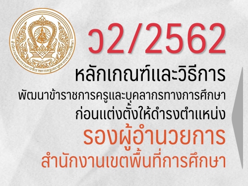 ว2/2562 หลักเกณฑ์เเละวิธีการพัฒนาข้าราชการครูเเละบุคลากรทางการศึกษาก่อนเเต่งตั้งให้ดำรงตำเเหน่งรองผู้อำนวยการสำนักงานเขตพื้นที่การศึกษา