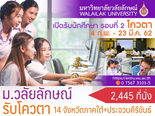 มหาวิทยาลัยวลัยลักษณ์ รับสมัครนักศึกษา TCASรอบ 2 โควตา 14 จังหวัดภาคใต้และจังหวัดประจวบคีรีขันธ์ ผ่านทางระบบอินเทอร์เน็ต http://entry.wu.ac.th จำนวน 2,445 คน ตั้งแต่บัดนี้ถึงวันที่ 23 มีนาคม 2562
