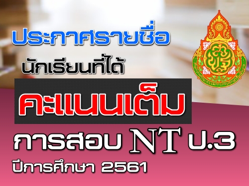 สำนักทดสอบทางการศึกษา สพฐ. ประกาศรายชื่อเด็กนักเรียนที่ทำการทดสอบความสามารถด้านภาษา,ความสามารถด้านคำนวณ,ความสามารถด้านเหตุผล ได้คะแนนเต็มจากการทดสอบความสามารถพื้นฐานของผู้เรียนระดับชาติ (National Test: NT) นักเรียนชั้นประถมศึกษาปีที่ 3 ปีการศึกษา 2561