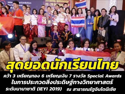 วันที่ 25 ตุลาคม 2562 ดร.อโณทัย ไทยวรรณศรี ผู้อำนวยการสำนักพัฒนานวัตกรรมการจัดการศึกษา สำนักงานคณะกรรมการการศึกษาขั้นพื้นฐาน เปิดเผยว่า ตามที่สำนักงานคณะกรรมการการศึกษาขั้นพื้นฐาน (สพฐ.) ได้ส่งคณะนักเรียนไทยเข้าร่วมการจัดแสดงและประกวดผลงานสิ่งประดิษฐ์ทางวิทยาศาสตร์ ระดับนานาชาติ ในงาน International Exhibition for Young Inventors (IEYI 2019) ระหว่างวันที่ 22 - 26 ตุลาคม จังหวัดบันเติน สาธารณรัฐอินโดนีเซีย โดยมีนักเรียนเข้าร่วมการแข่งขันจำนวน 9 ทีม รวม 17 คน ซึ่งจากการตัดสินของคณะกรรมการ มีผลการแข่งขันปรากฏว่า มีนักเรียนได้รับรางวัลครบทุกทีม แบ่งเป็น เหรียญทอง 3 รางวัล เหรียญเงิน 6 รางวัล และ Special Awards 7 รางวัล ดังนี้