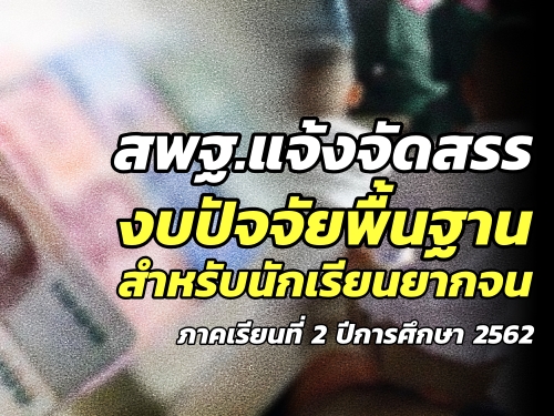 สำนักงานคณะกรรมการการศึกษาขั้นพื้นฐาน มีหนังสือ แจ้งจัดสรรงบประมาณปี พ.ศ. 2563 (งบประมาณปี พ.ศ. 2562 ไปพลางก่อน) งบเงินอุดหนุน รายการค่าจัดการเรียนการสอน (ปัจจัยพื้นฐานสำหรับนักเรียนยากจน) ภาคเรียนที่ 2 ปีการศึกษา 2562 รายละเอียด ดังนี้