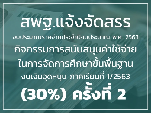 จัดสรรงบประมาณรายจ่ายประจำปีงบประมาณ พ.ศ. 2563 กิจกรรมการสนับสนุนค่าใช้จ่ายในการจัดการศึกษาขั้นพื้นฐาน งบเงินอุดหนุน ภาคเรียนที่ 1/2563 (30%) ครั้งที่ 2