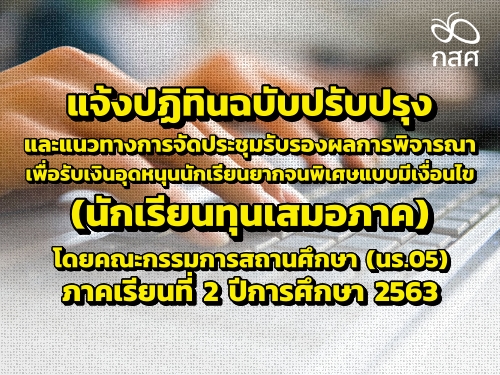 แจ้งปฏิทินฉบับปรับปรุงและแนวทางการจัดประชุมรับรองผลการพิจารณาเพื่อรับเงินอุดหนุนนักเรียนยากจนพิเศษแบบมีเงื่อนไข (นักเรียนทุนเสมอภาค) โดยคณะกรรมการสถานศึกษา (นร.05) ภาคเรียนที่ 2 ปีการศึกษา 2563