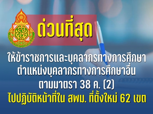 ด่วนที่สุด เรื่อง ให้ข้าราชการและบุคลากรทางการศึกษา ตำแหน่งบุคลากรทางการศึกษาอื่นตามมาตรา 38 ค. (2) ไปปฏิบัติหน้าที่ใน สพม. ตามการกำหนดเขตพื้นที่การศึกษามัธยมศึกษาใหม่ จำนวน 62 เขต