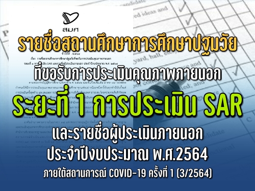 รายชื่อสถานศึกษาการศึกษาปฐมวัยที่ขอรับการประเมินคุณภาพภายนอกระยะที่ 1 การประเมิน SAR และรายชื่อผู้ประเมินภายนอก ประจำปีงบประมาณ พ.ศ.2564 ภายใต้สถานการณ์ COVID-19 ครั้งที่ 1 (3/2564)