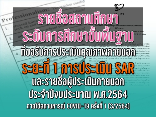 รายชื่อสถานศึกษาระดับการศึกษาขั้นพื้นฐานที่รับการประเมินคุณภาพภายนอก ระยะที่ 1 การประเมิน SAR และรายชื่อผู้ประเมินภายนอก ประจำปีงบประมาณ พ.ศ.2564 ภายใต้สถานการณ์ COVID-19 ครั้งที่ 1 (3/2564)